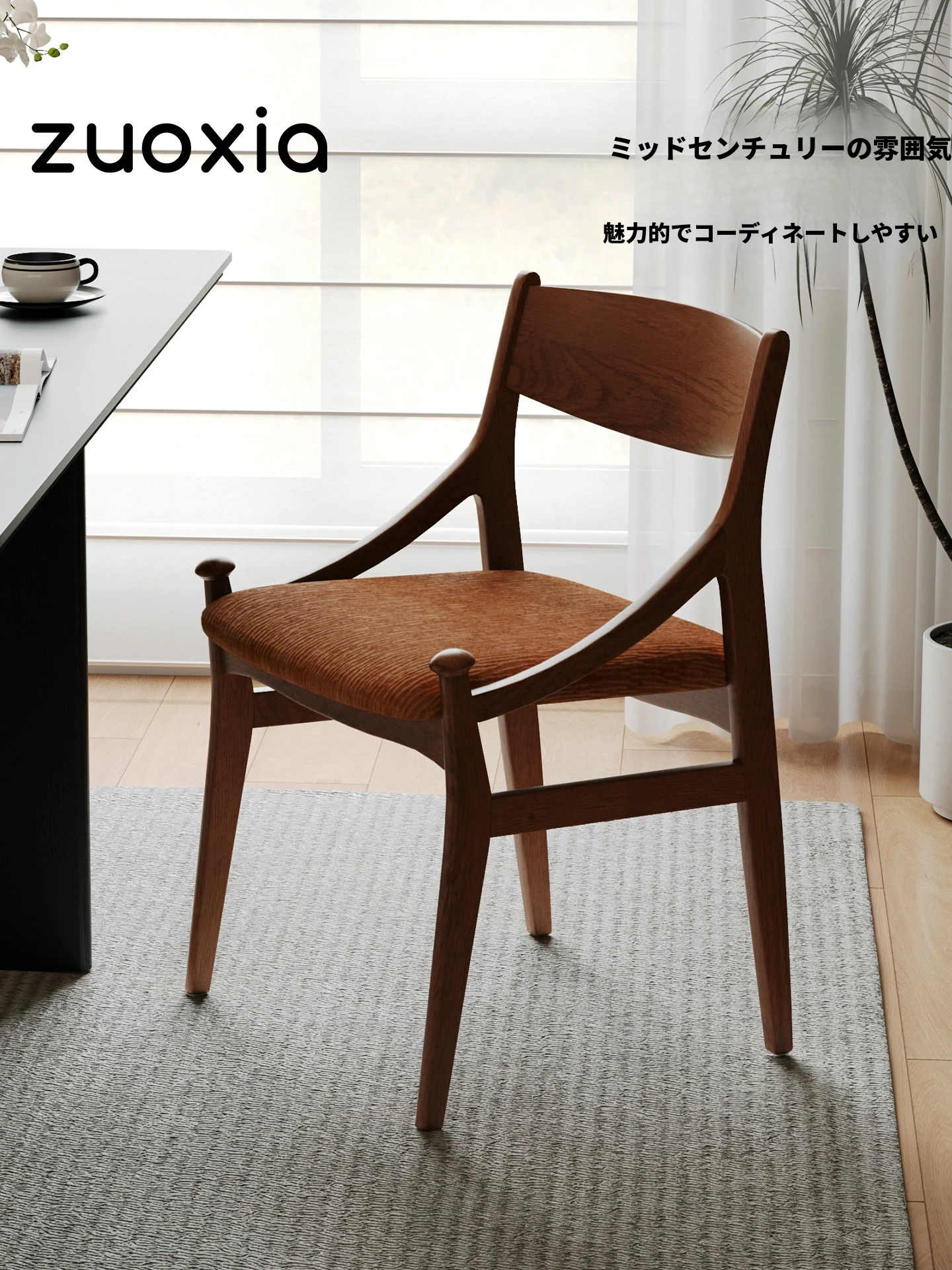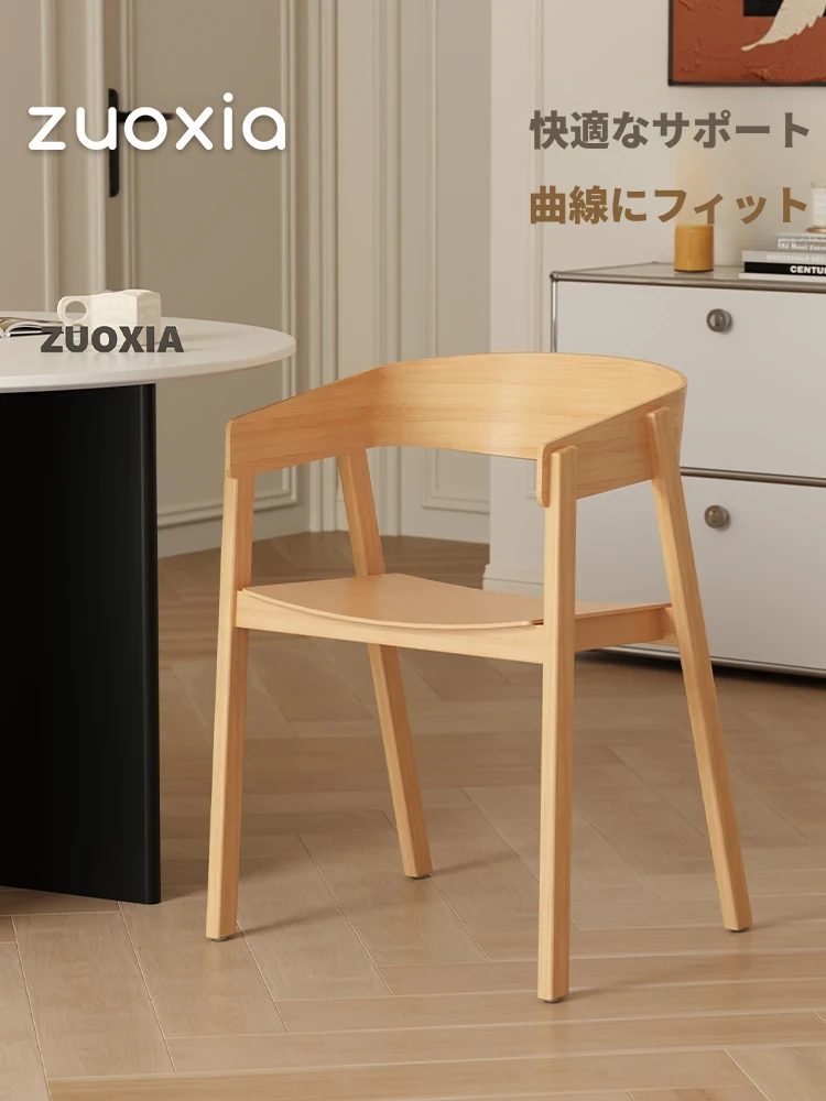 北欧風のシンプルな実木ダイニングチェア - 左下の肘掛け付き、快適な背もたれで、食事のひとときをスタイリッシュに演出!和風の創造的なデザインで、どんな食卓にもぴったり。