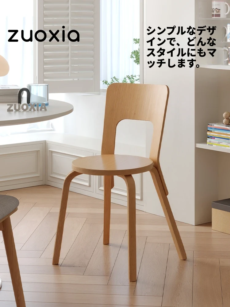 北欧スタイルの実木製ダイニングチェア - 左下カリールデザイン、リラックスできる背もたれ付き、小型スペースにも最適な居心地の良いインテリア!