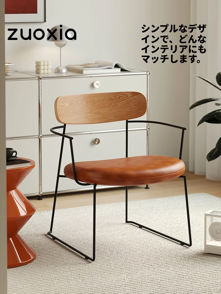 左下サドゥアームチェア - モダンでシンプルなデザイン、柔らかなクッション付き。家庭用やバルコニーでのリラックスタイムに最適!カフェや商談にもぴったりな背もたれ付きの快適な椅子です。