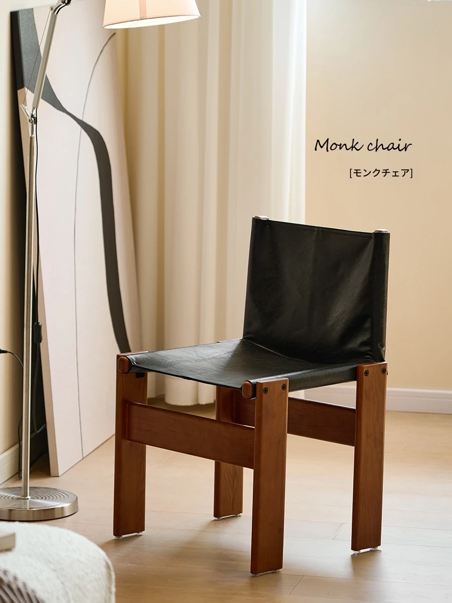 左下僧侶の椅子 - ヴィンテージ風の無垢材を使用したデザイナーレストランチェア。贅沢な本革仕上げで、アートなティーテーブルチェアとしても最適。トレンドの一人掛け椅子で、あなたの空間に洗練されたスタイルをプラス!