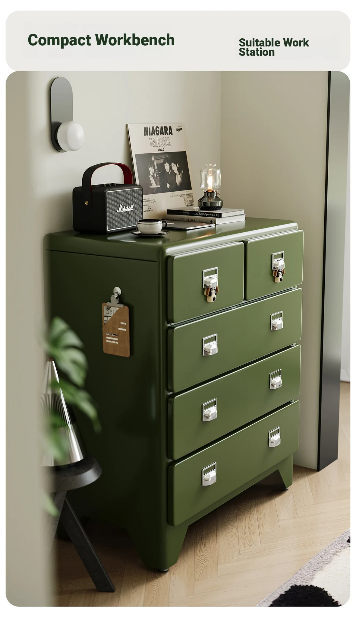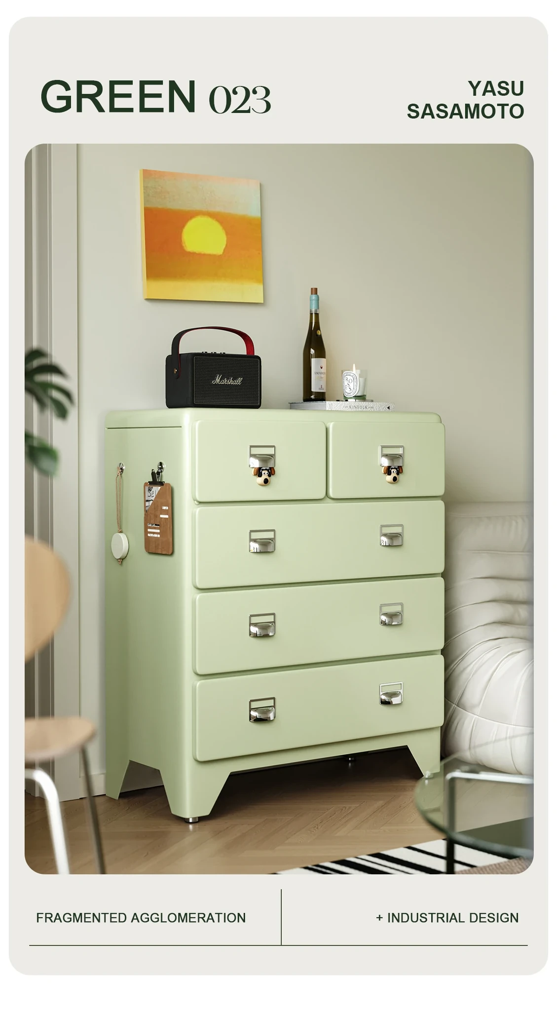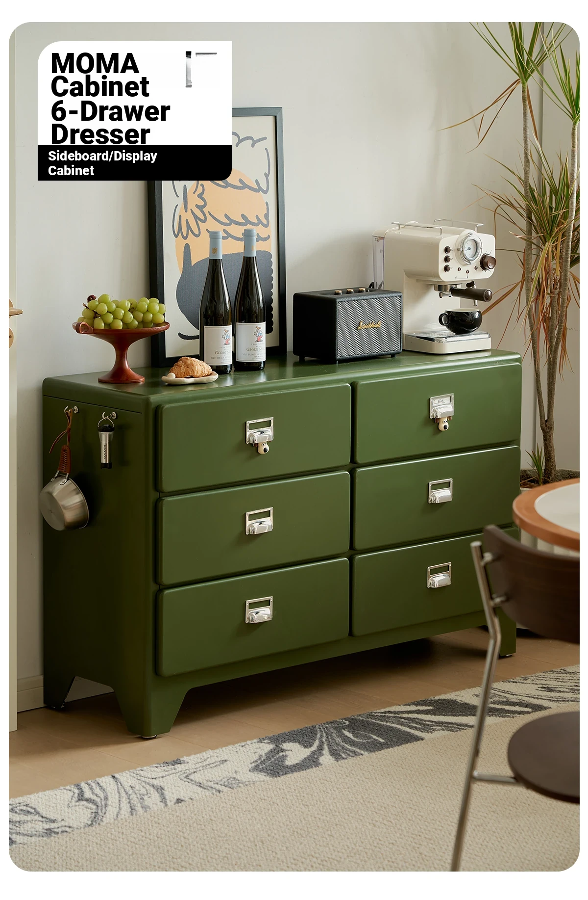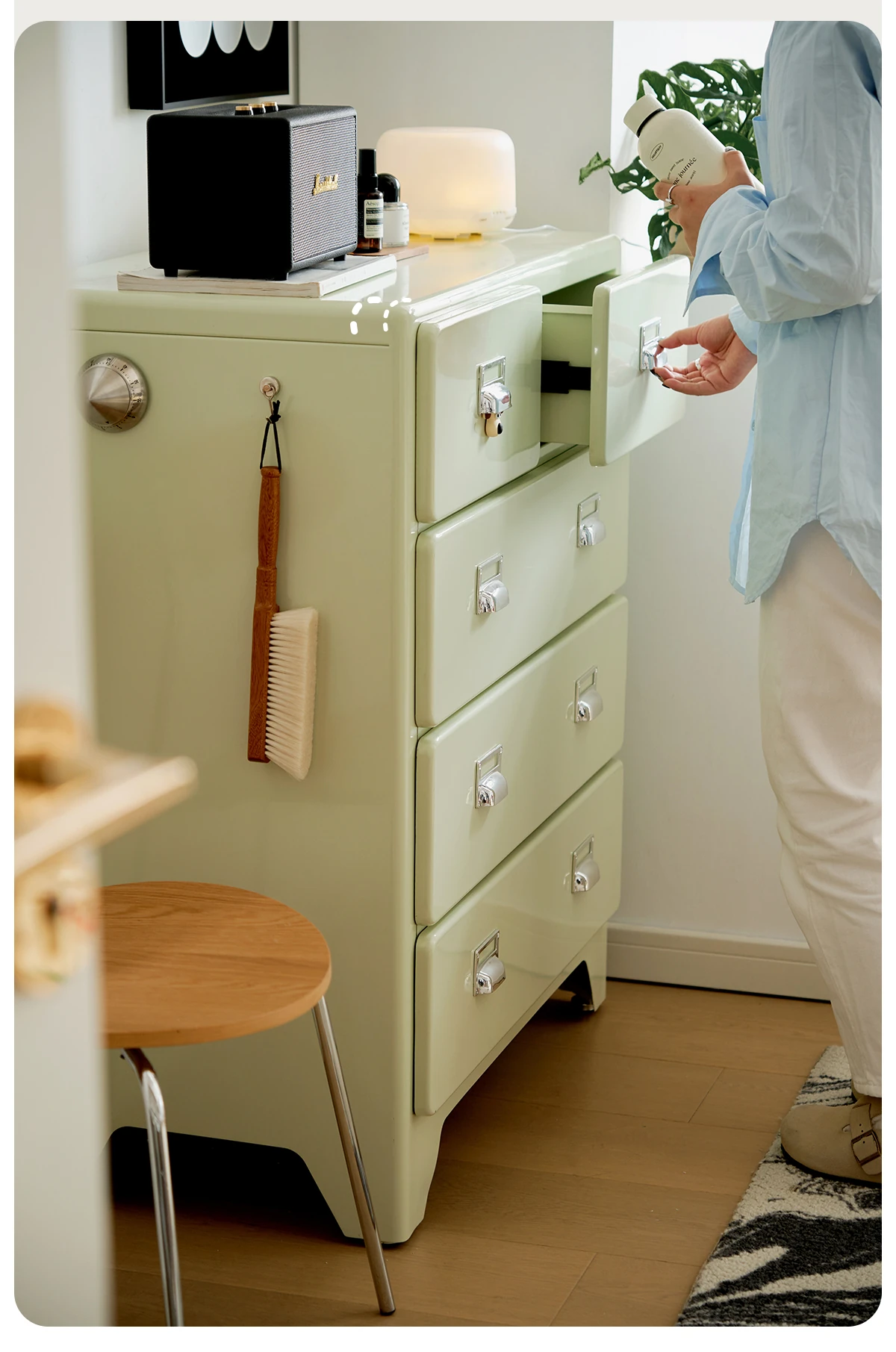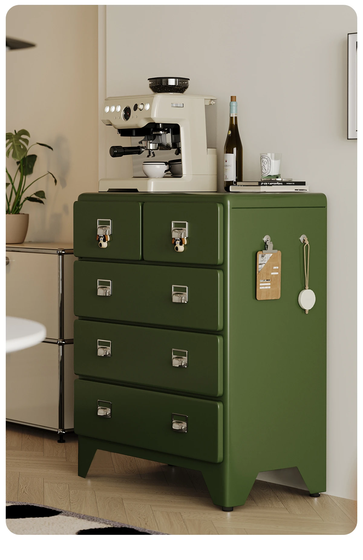 左下MOMA風レトロ鉄製4段5引き出しキャビネット - 中古の和風ダイニングサイドボード、リビングルームにぴったりな金属製の収納家具!