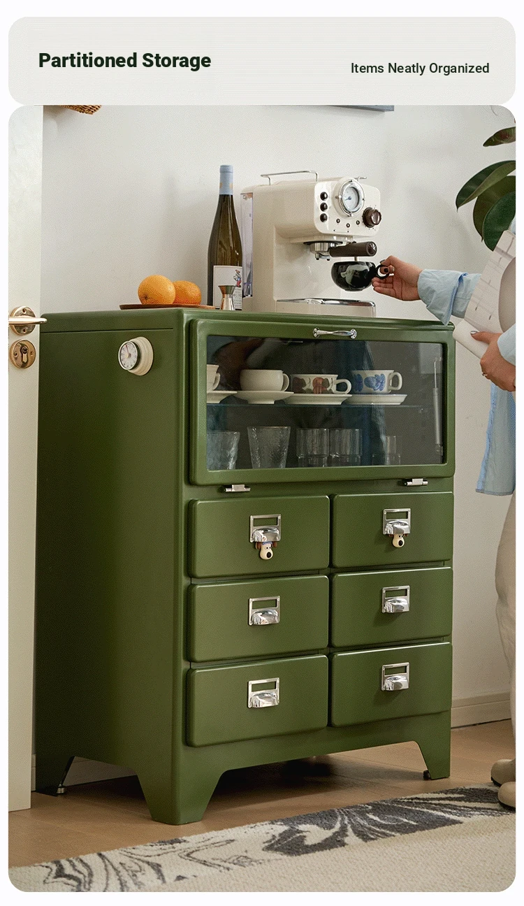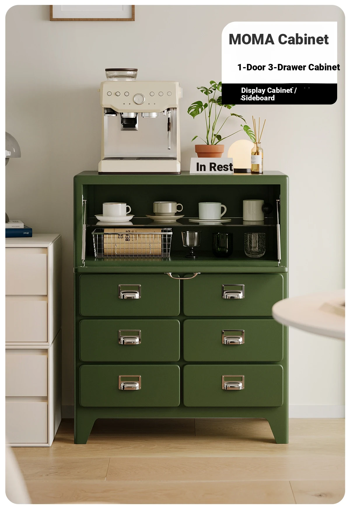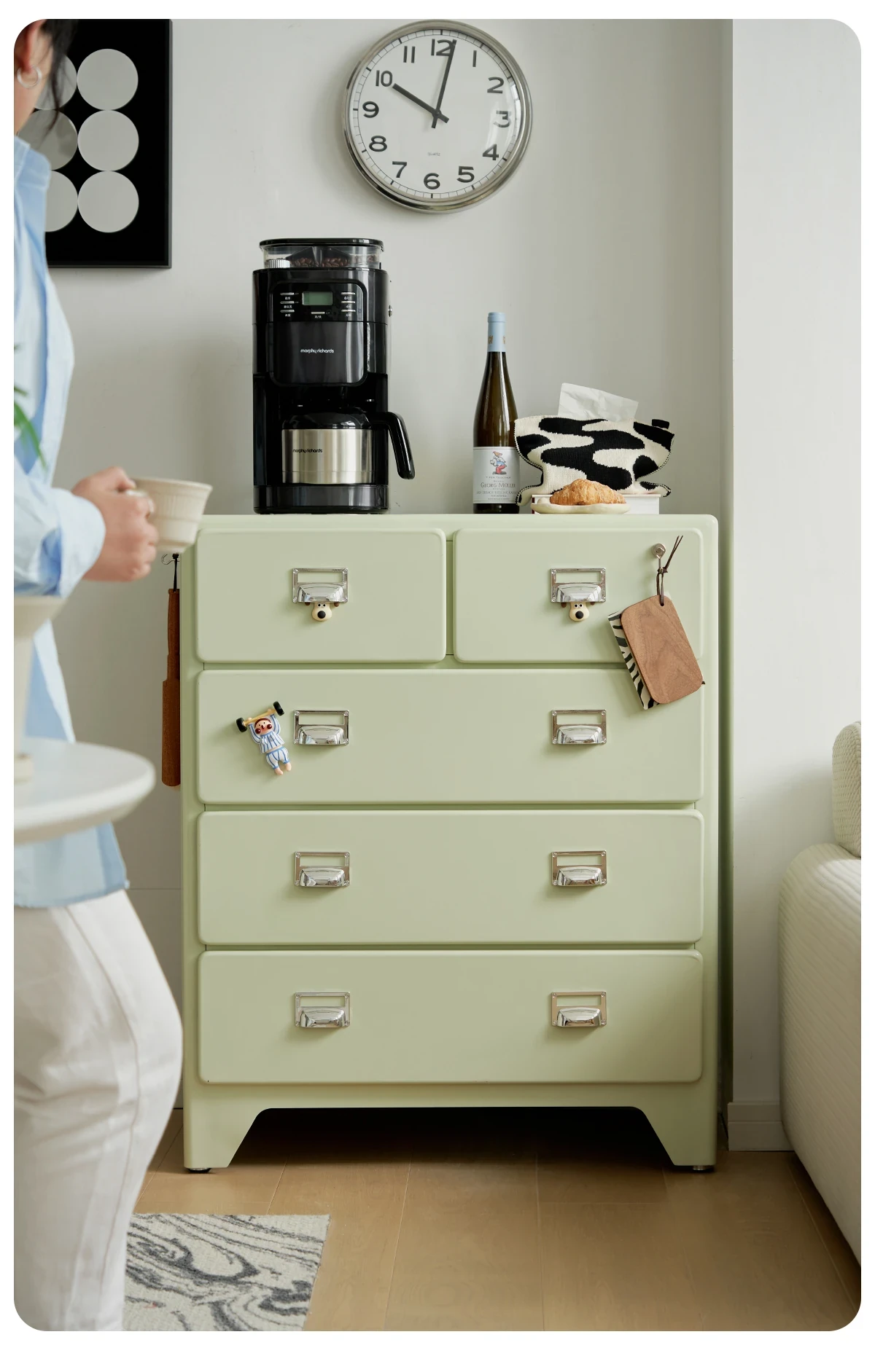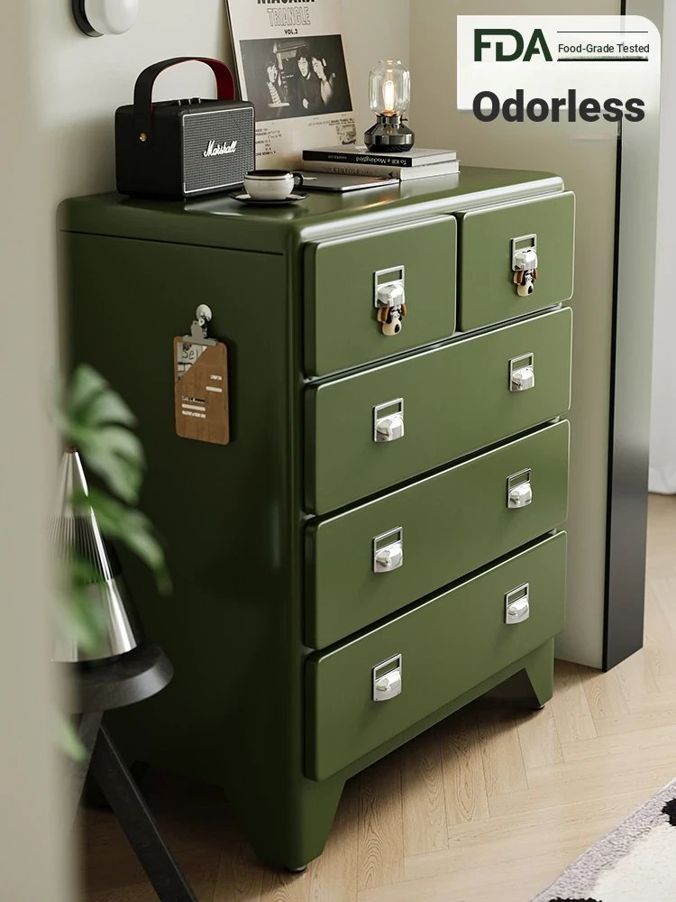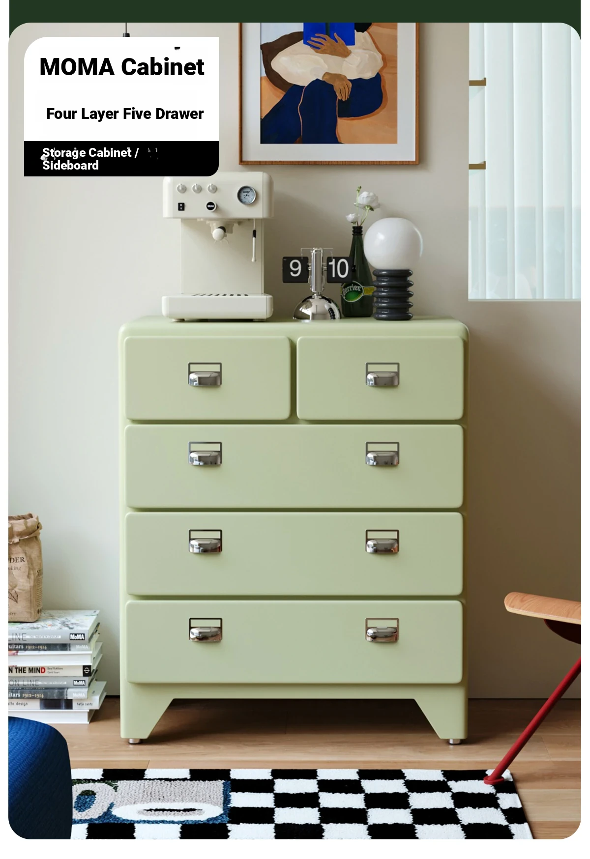 左下MOMA風レトロ鉄製4段5引き出しキャビネット - 中古の和風ダイニングサイドボード、リビングルームにぴったりな金属製の収納家具!