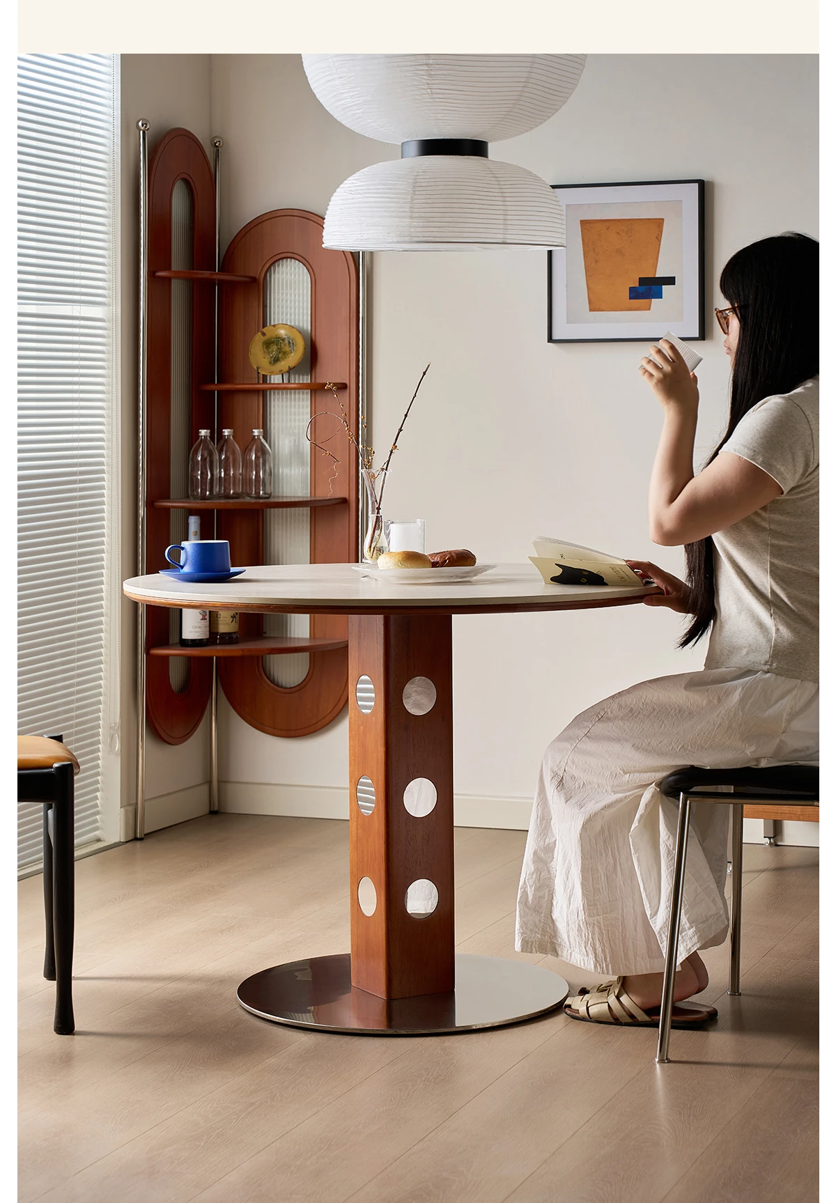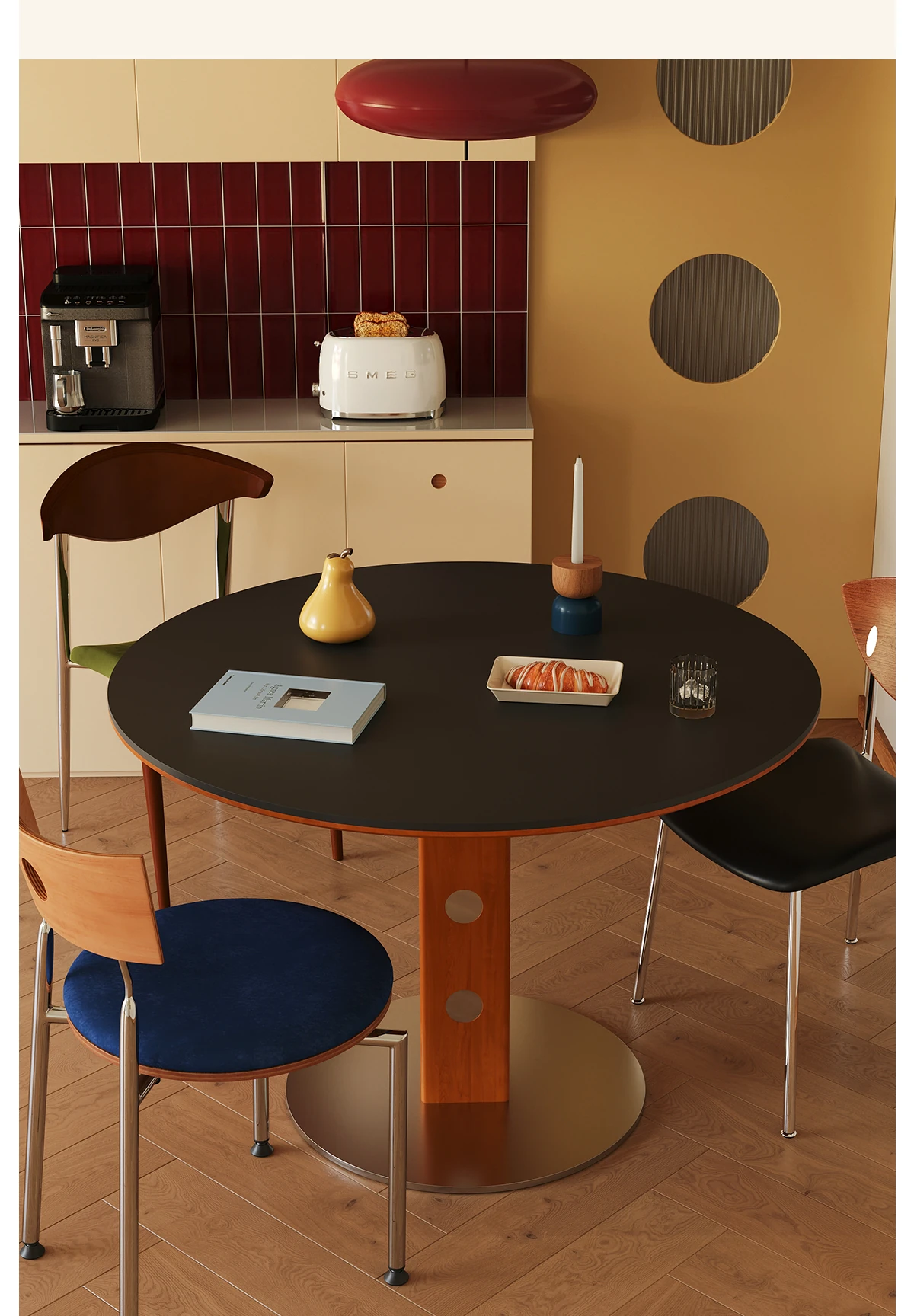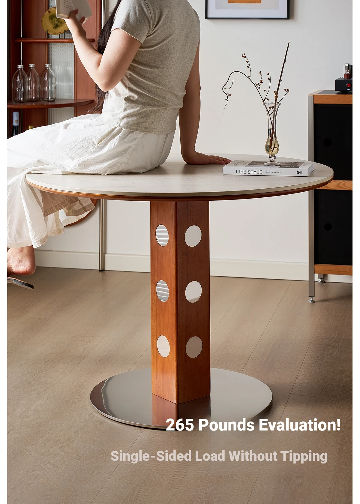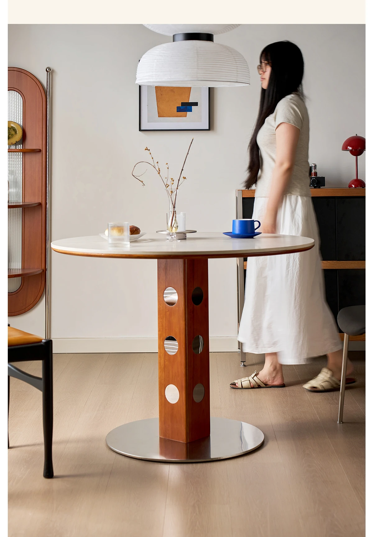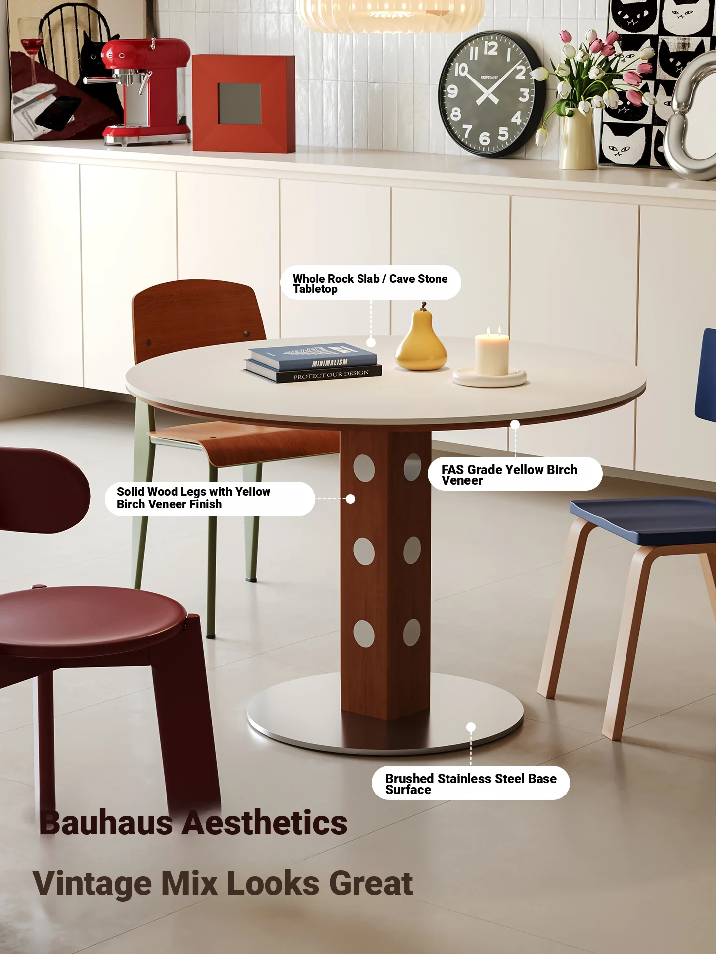 左下バーグのヴィンテージ風丸型ダイニングテーブル - 小さなお部屋にもぴったり!バウハウススタイルの実木と岩板仕様で、洗練された雰囲気を演出。おしゃれなリビングの必需品!