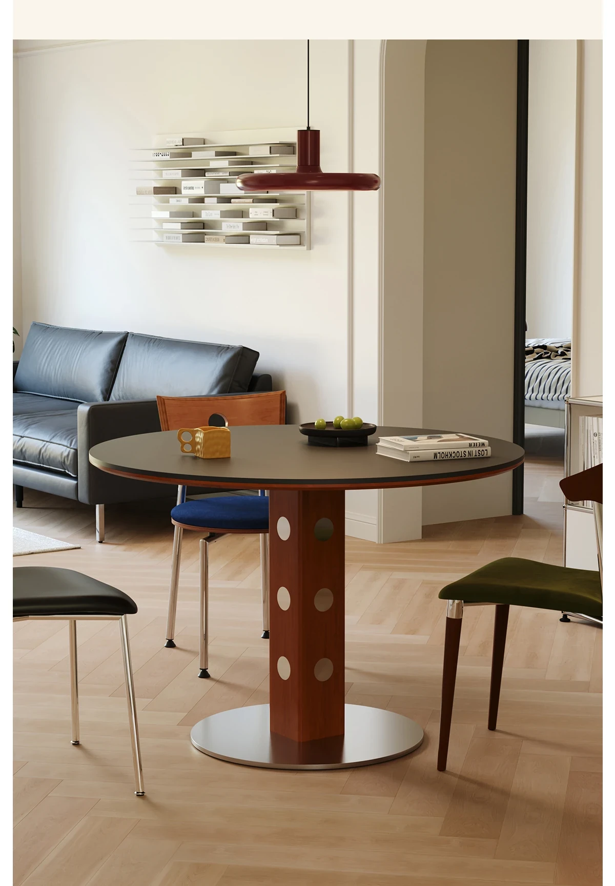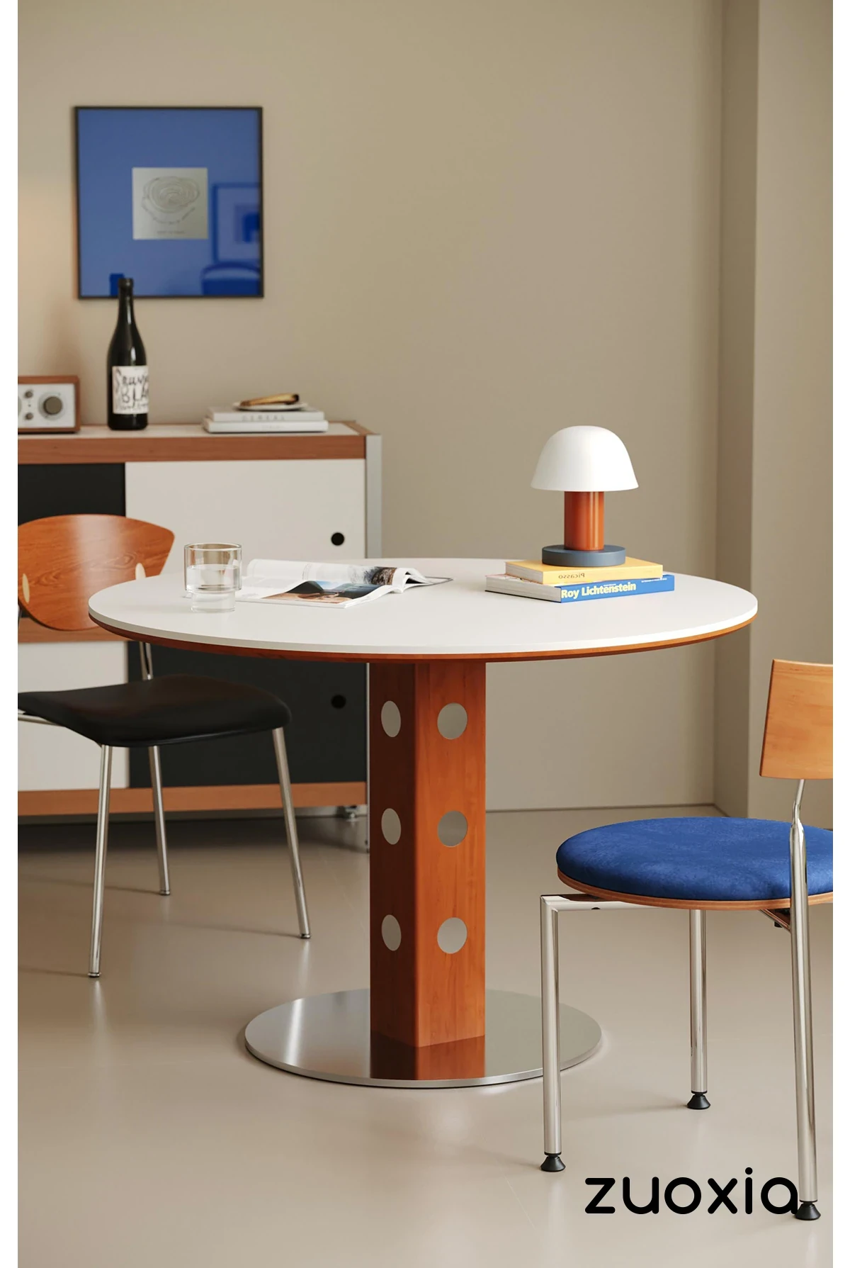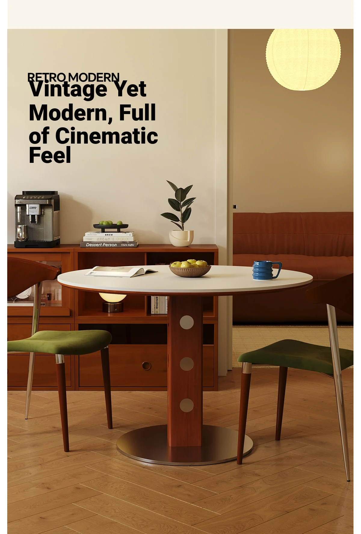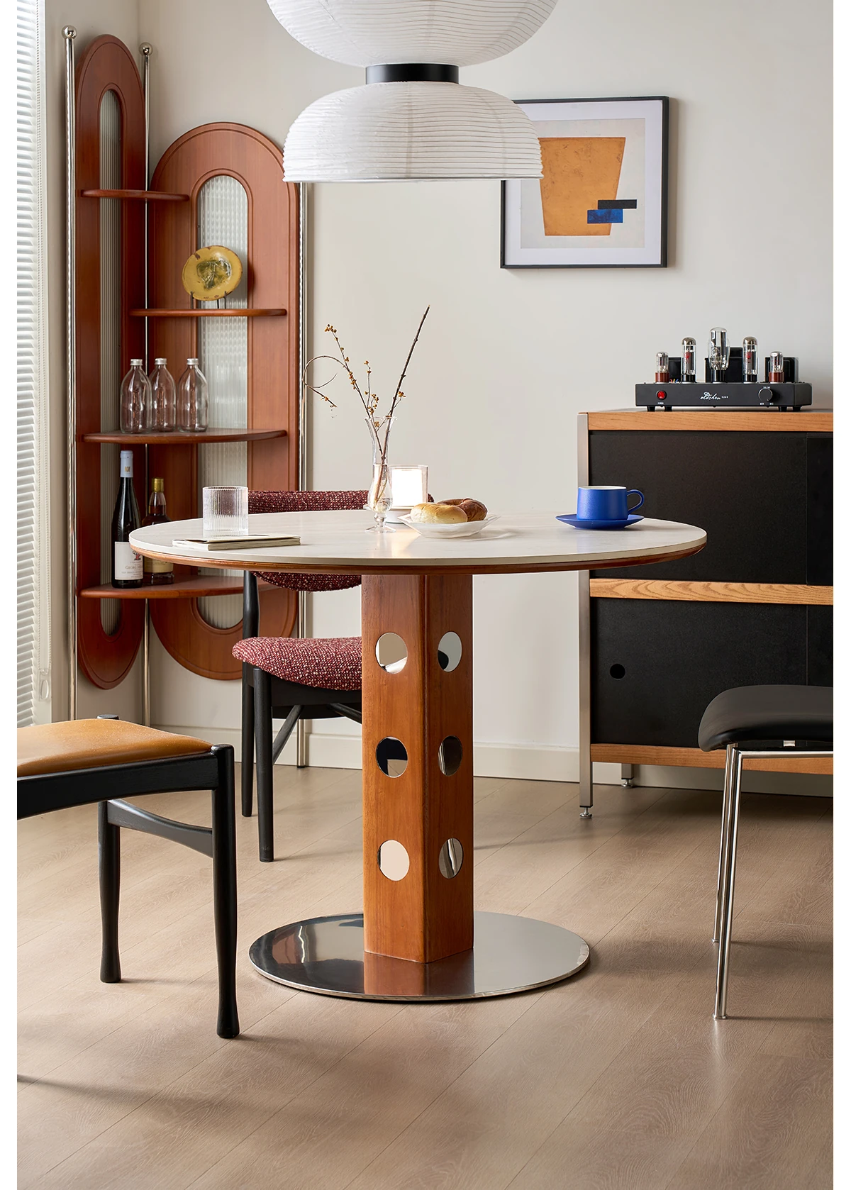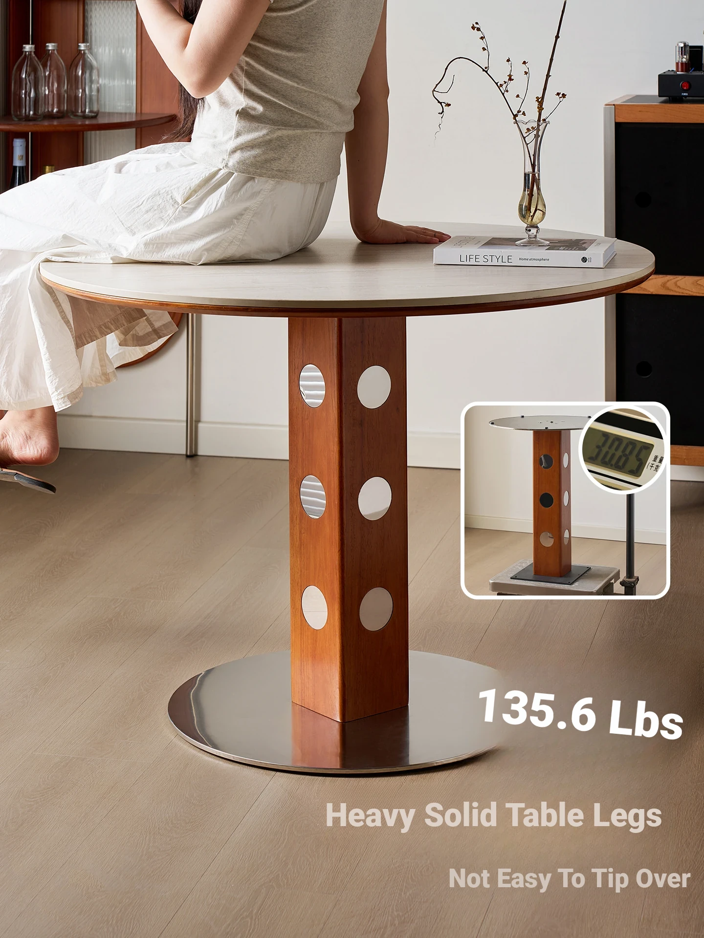 左下バーグのヴィンテージ風丸型ダイニングテーブル - 小さなお部屋にもぴったり!バウハウススタイルの実木と岩板仕様で、洗練された雰囲気を演出。おしゃれなリビングの必需品!