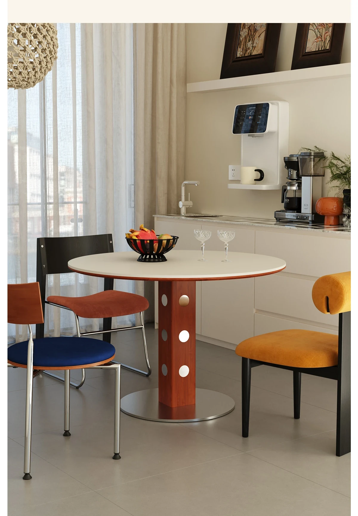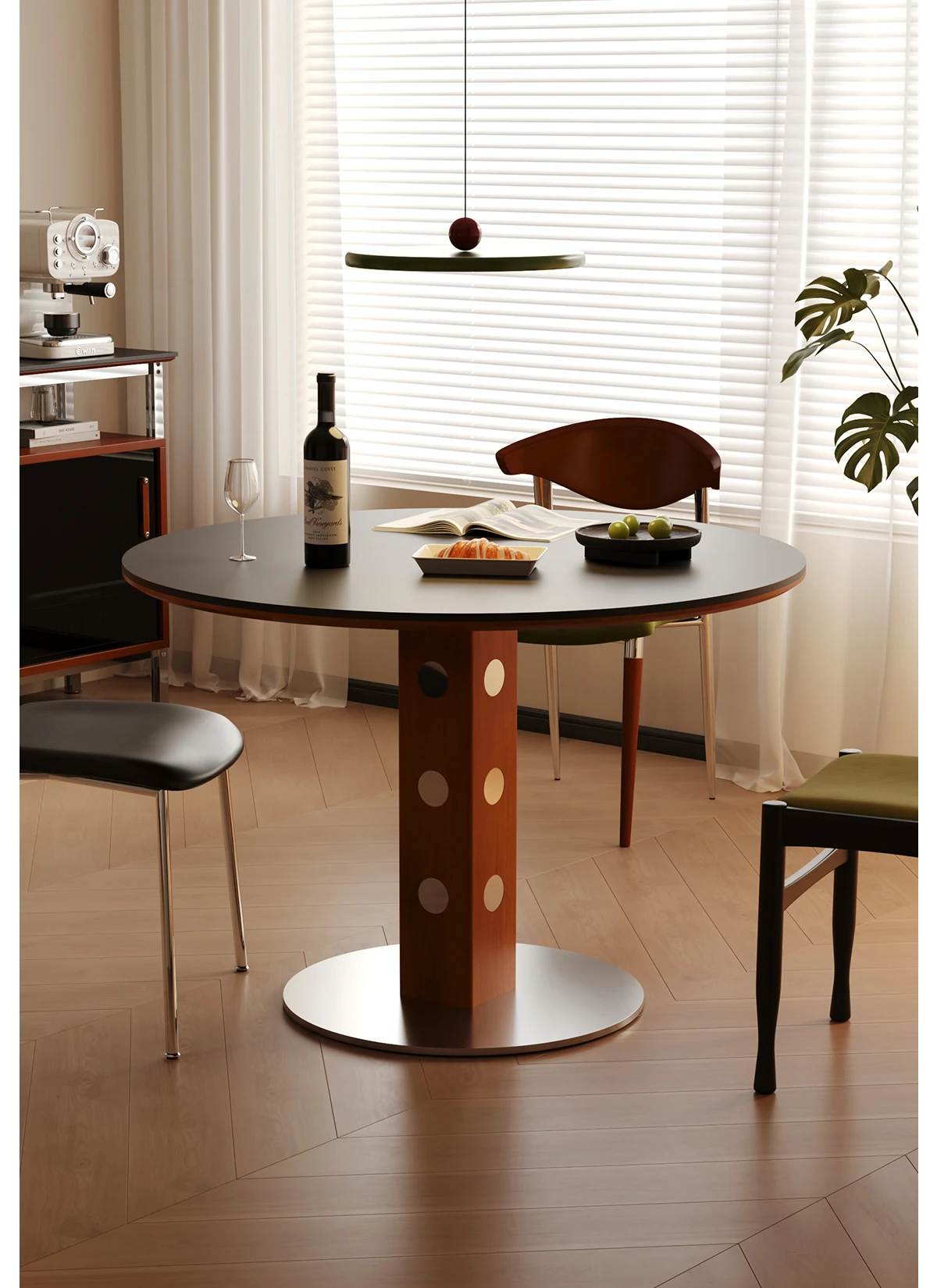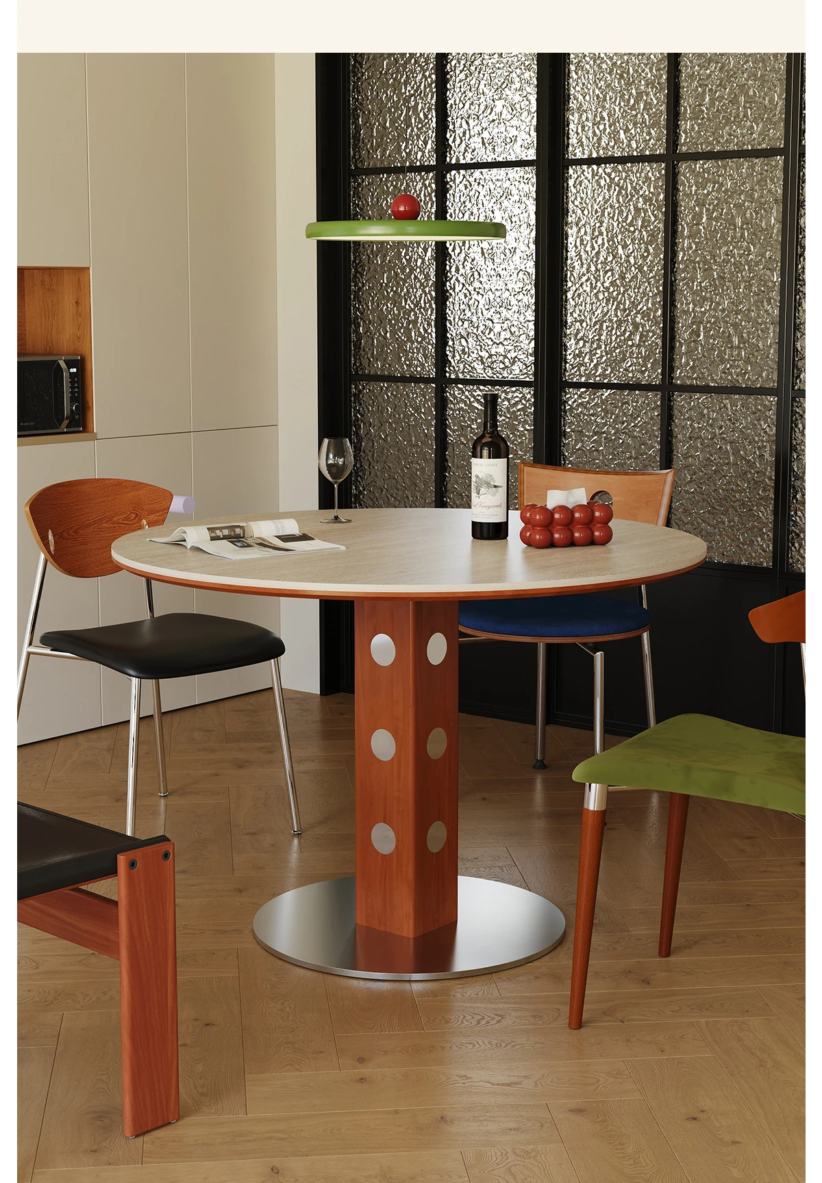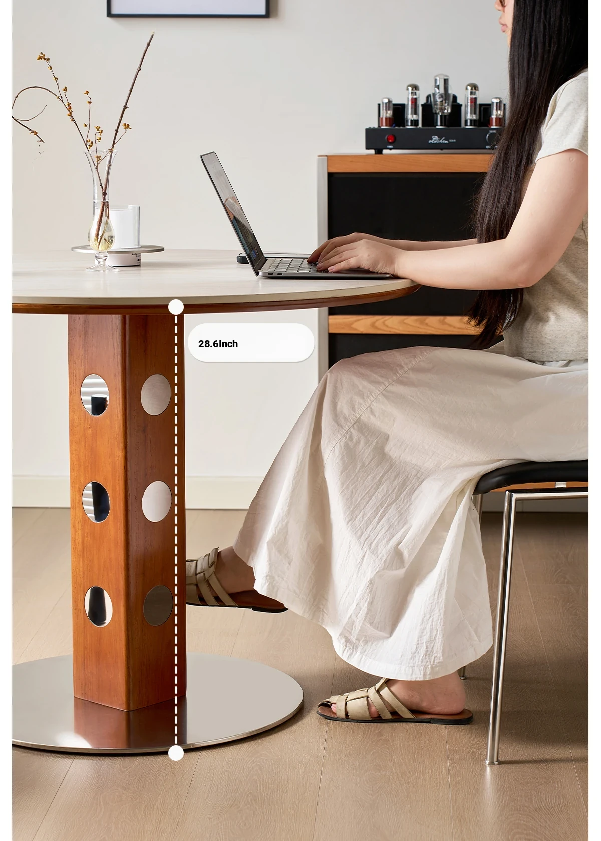 左下バーグのヴィンテージ風丸型ダイニングテーブル - 小さなお部屋にもぴったり!バウハウススタイルの実木と岩板仕様で、洗練された雰囲気を演出。おしゃれなリビングの必需品!