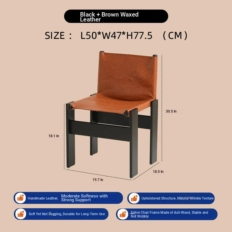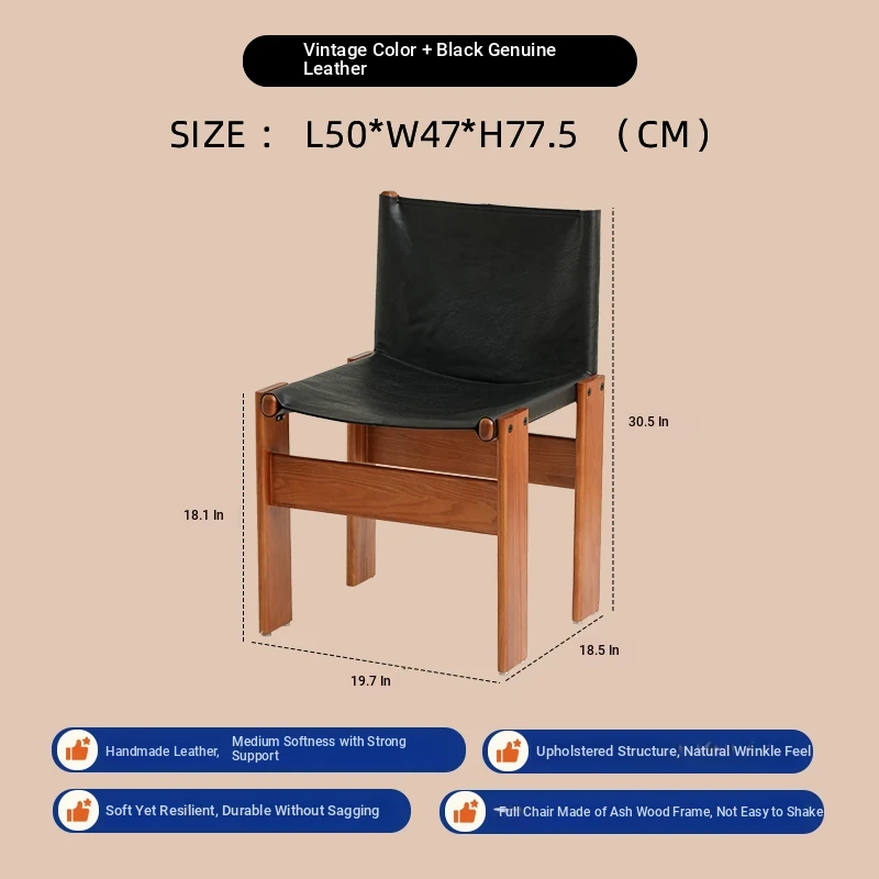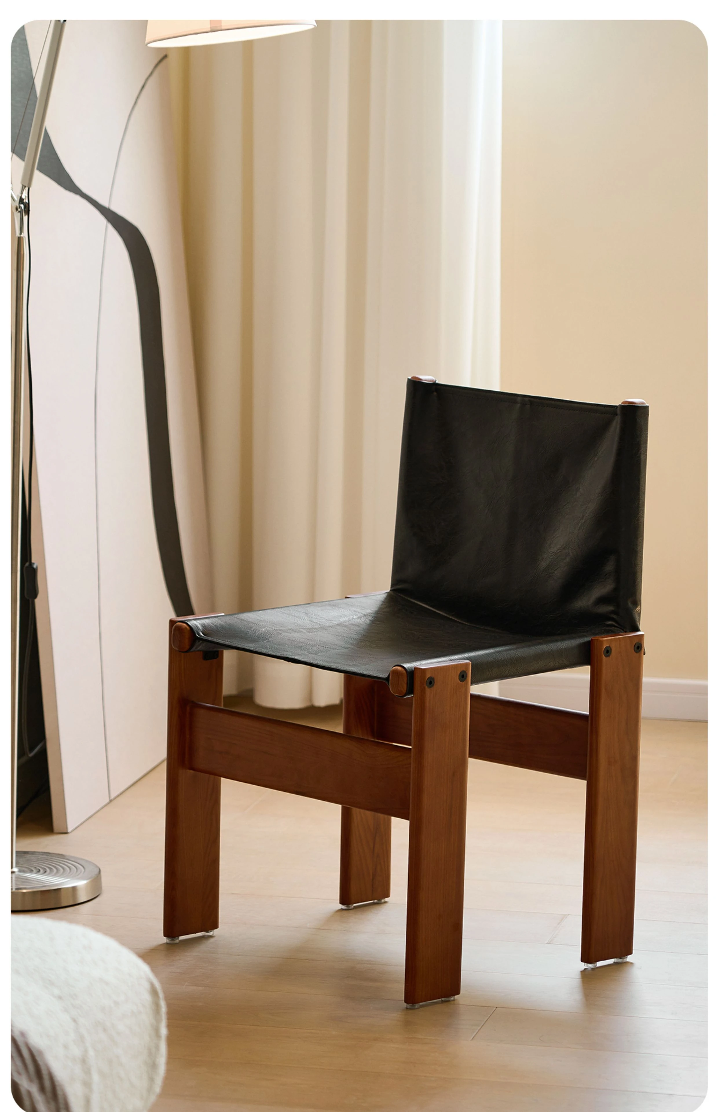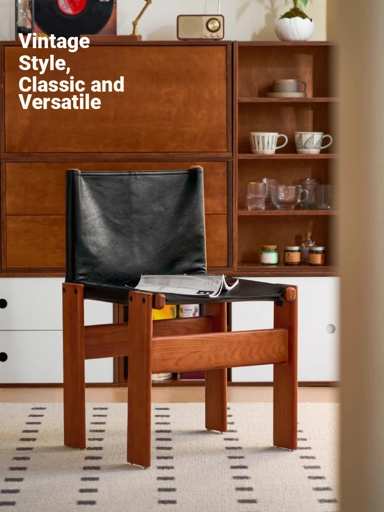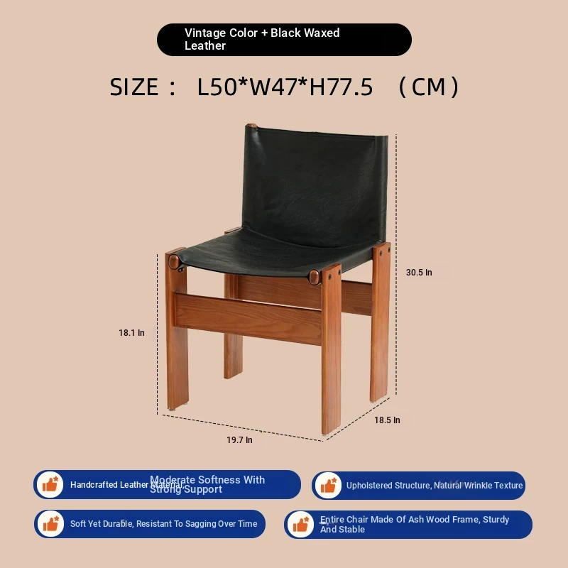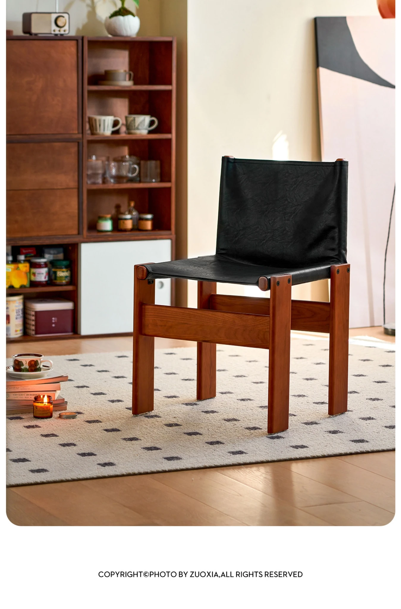 Vintage Solid Wood Dining Chair with Leather Upholstery - Zen-inspired Left-Bottom Monk Chair for Home and Restaurant, Perfect for Wabi-Sabi Aesthetics
