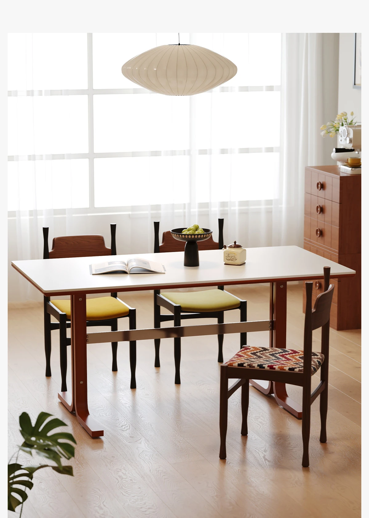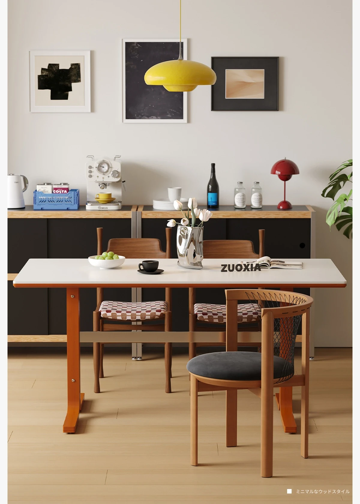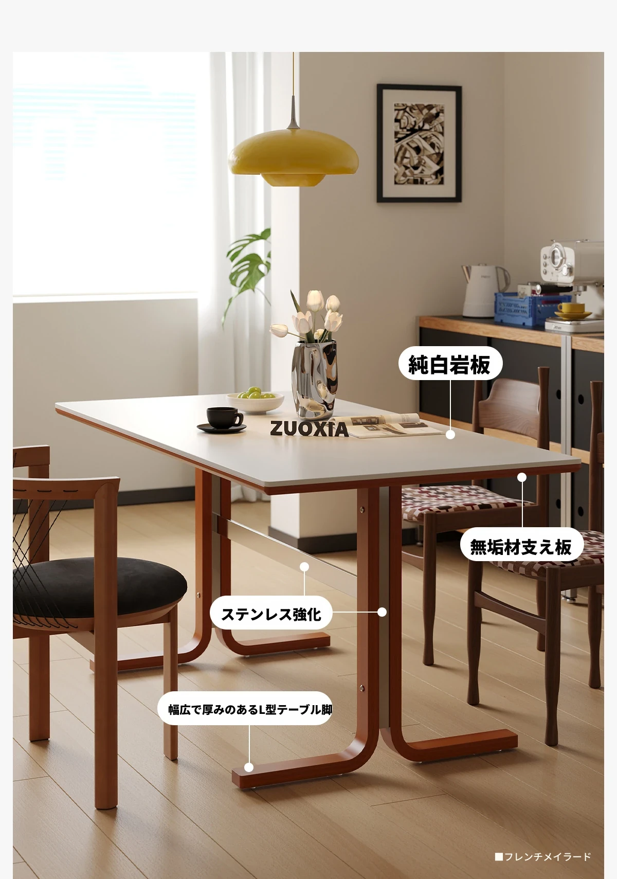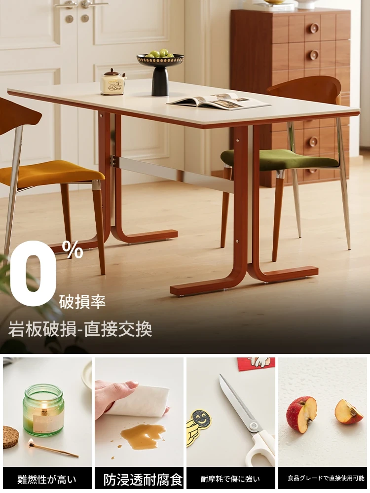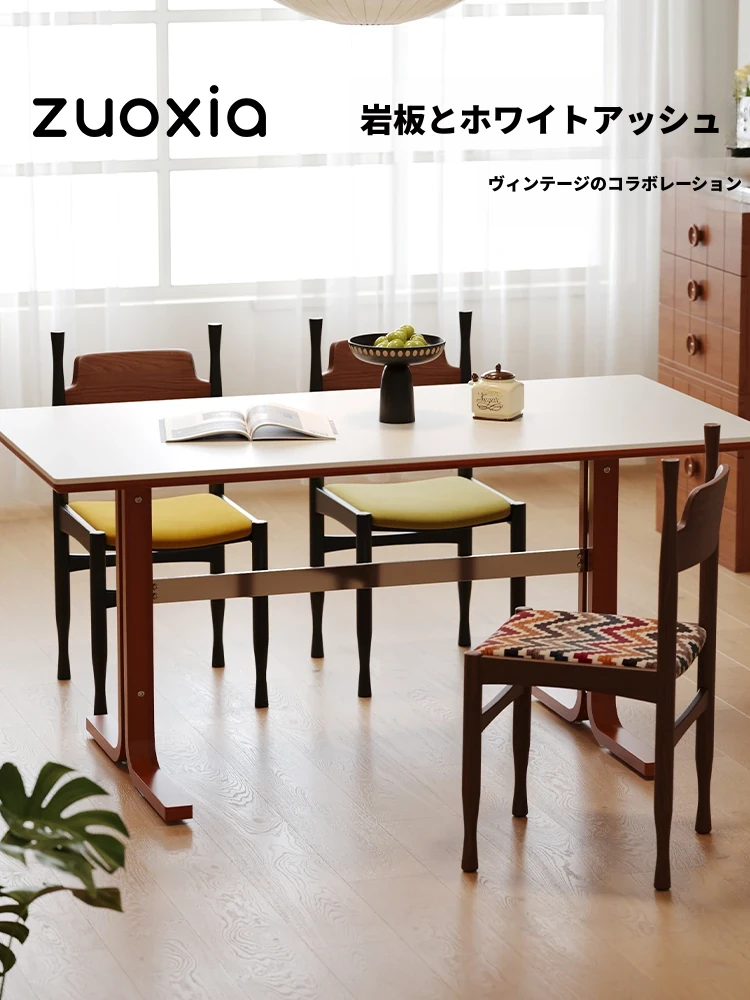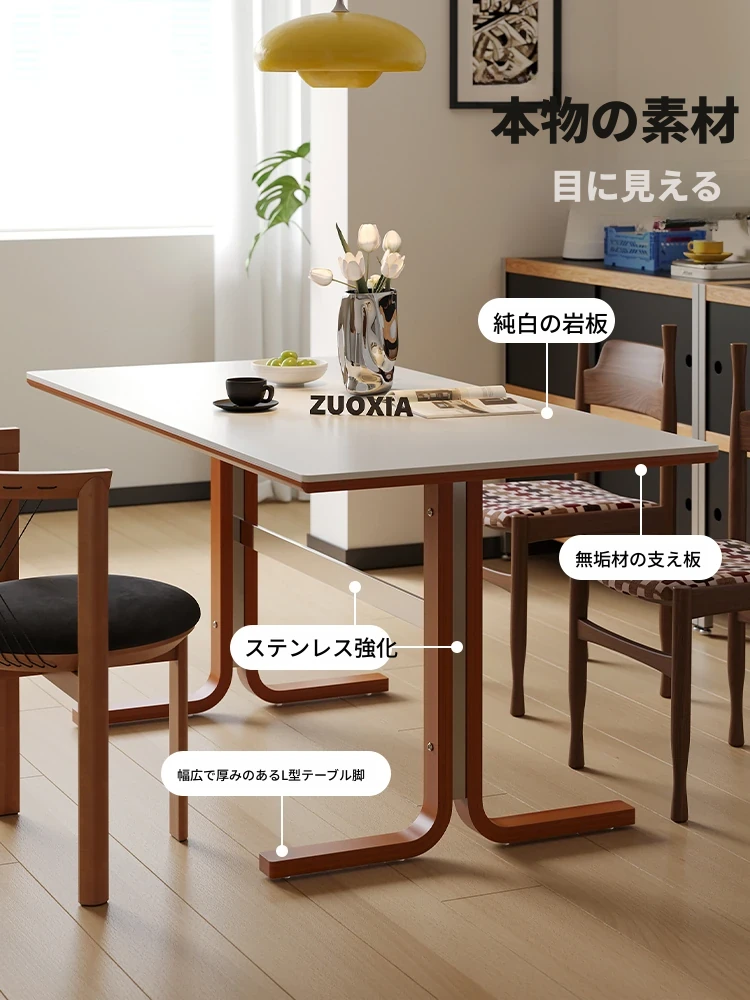 左下築索のヴィンテージスタイル長方形テーブル、2025年新作!高級感溢れる白い天然木製ダイニングテーブル。家族や友人との楽しい食卓を演出します。